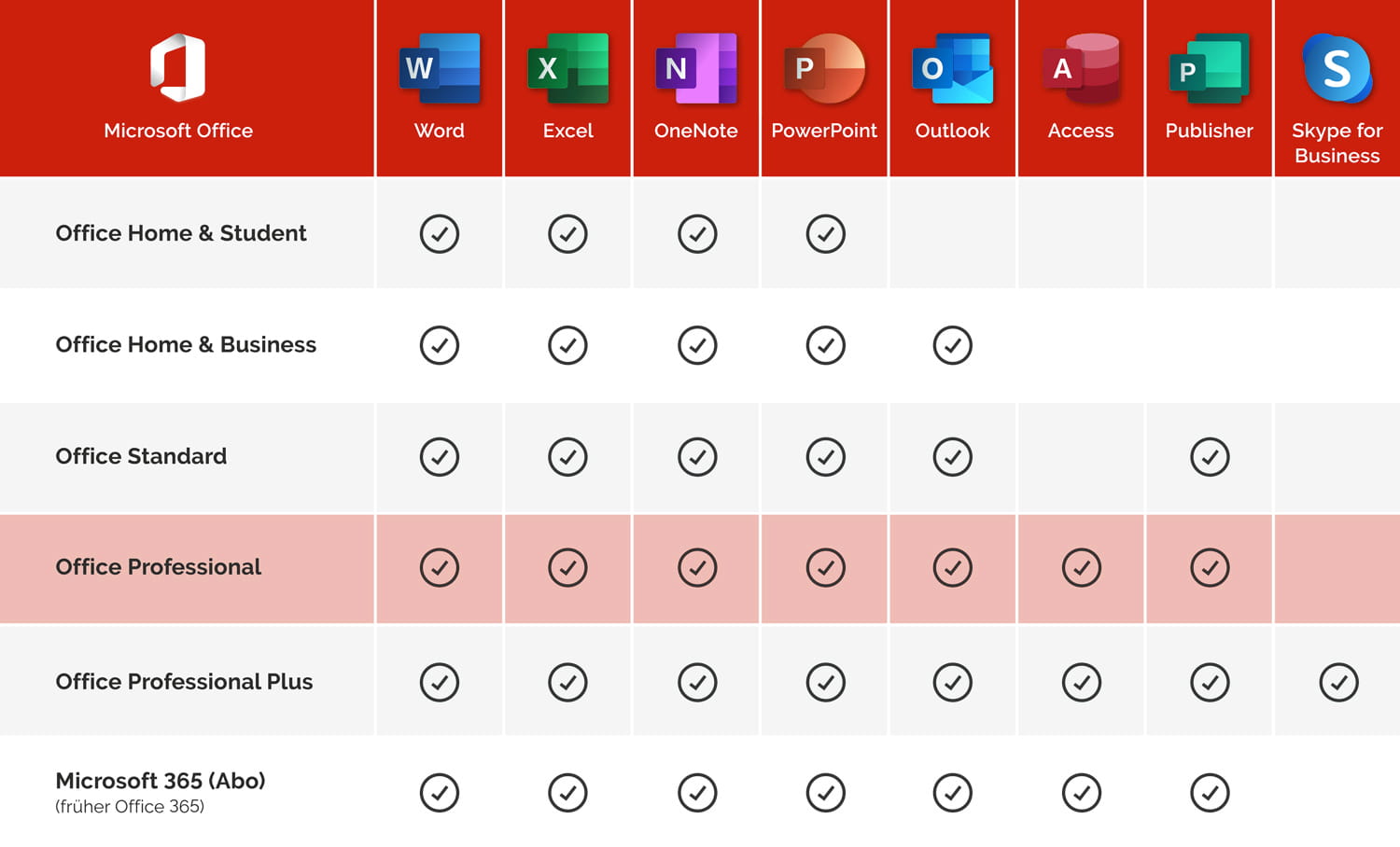 - contient Word, Excel, PowerPoint, Outlook, Publisher, Access et Skype for Business